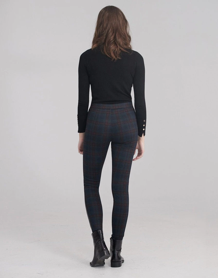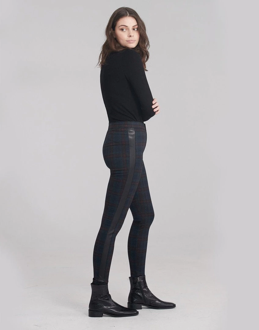 Rachel, our skinny silhouette, is fitted at the hip and ankle. Made of a stretch ponte fabric in plaid with vegan leather side stripe. This pant is designed to move with you no matter where your day (or night) takes you. The skinny silhouette and 30″ inseam is worn close to the body, creating a figure flattering fit for all body types.