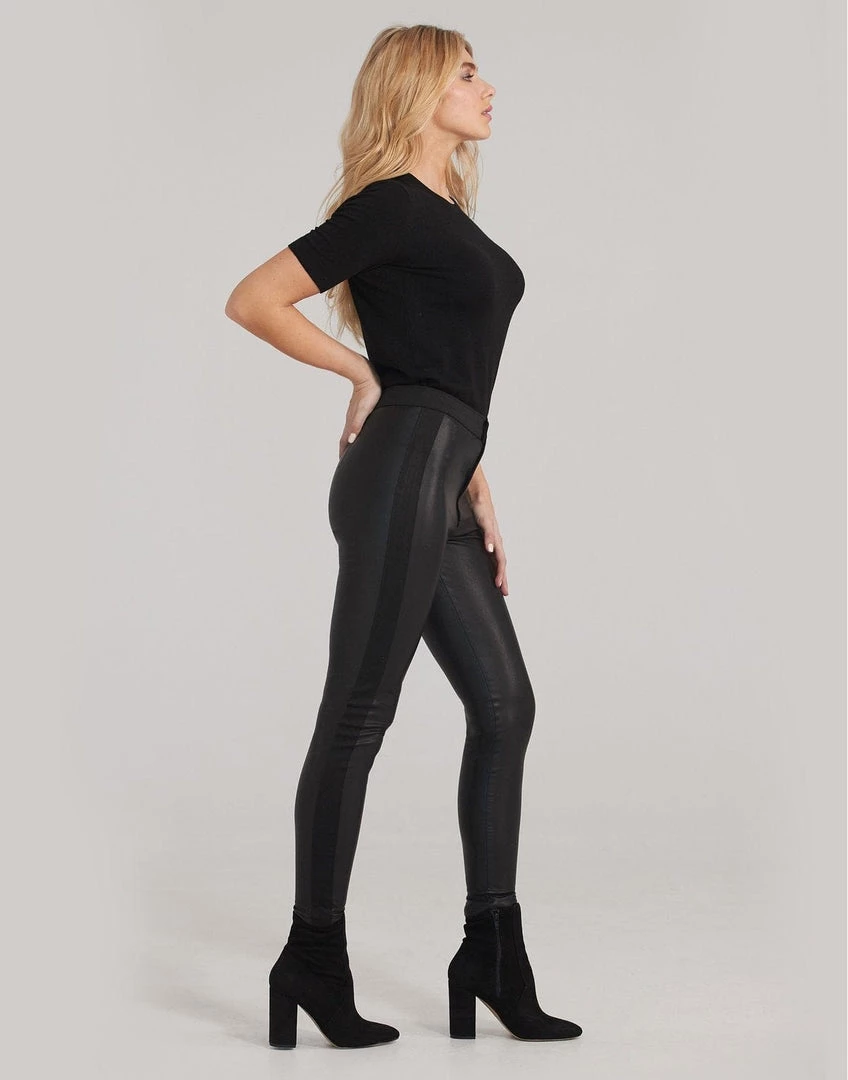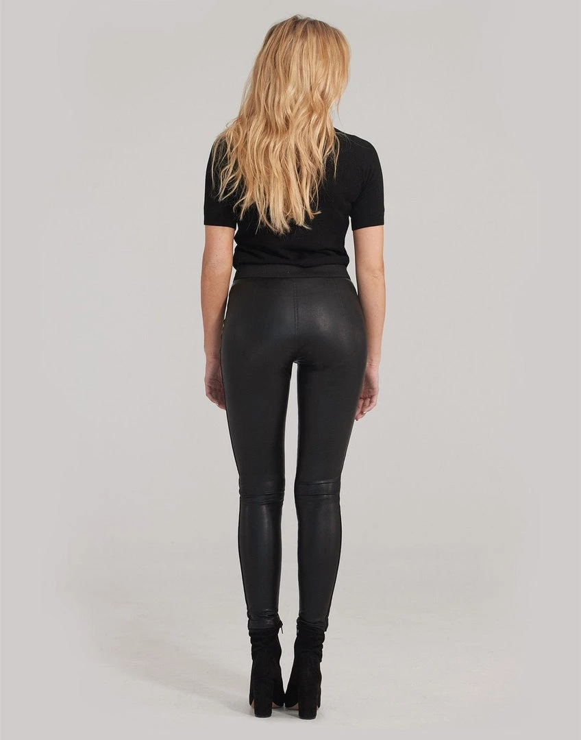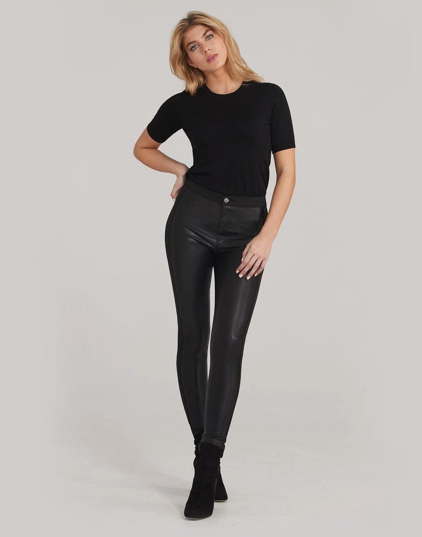 Rachel, our skinny silhouette, is fitted at the hip and ankle. Made of a stretch vegan leather fabric, this pant is designed to move with you no matter where your day (or night) takes you. The skinny silhouette and 30″ inseam is worn close to the body, creating a figure flattering fit for all body types.