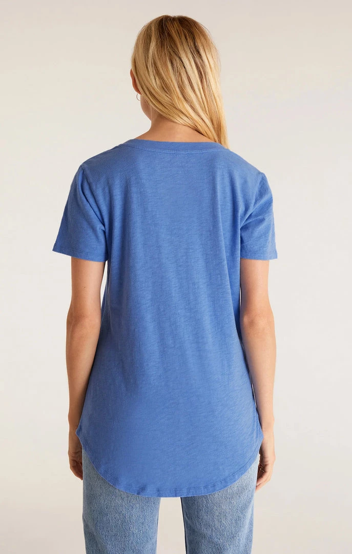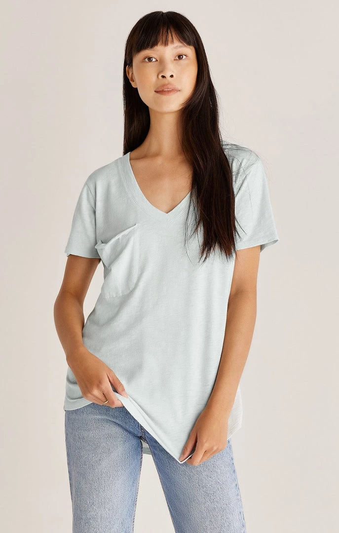 The Cotton Slub Pocket Tee is one of our best-selling silhouettes. This tee features a soft feel, v-neckline, slouchy pocket with raw edge, and curved shirttail hem.