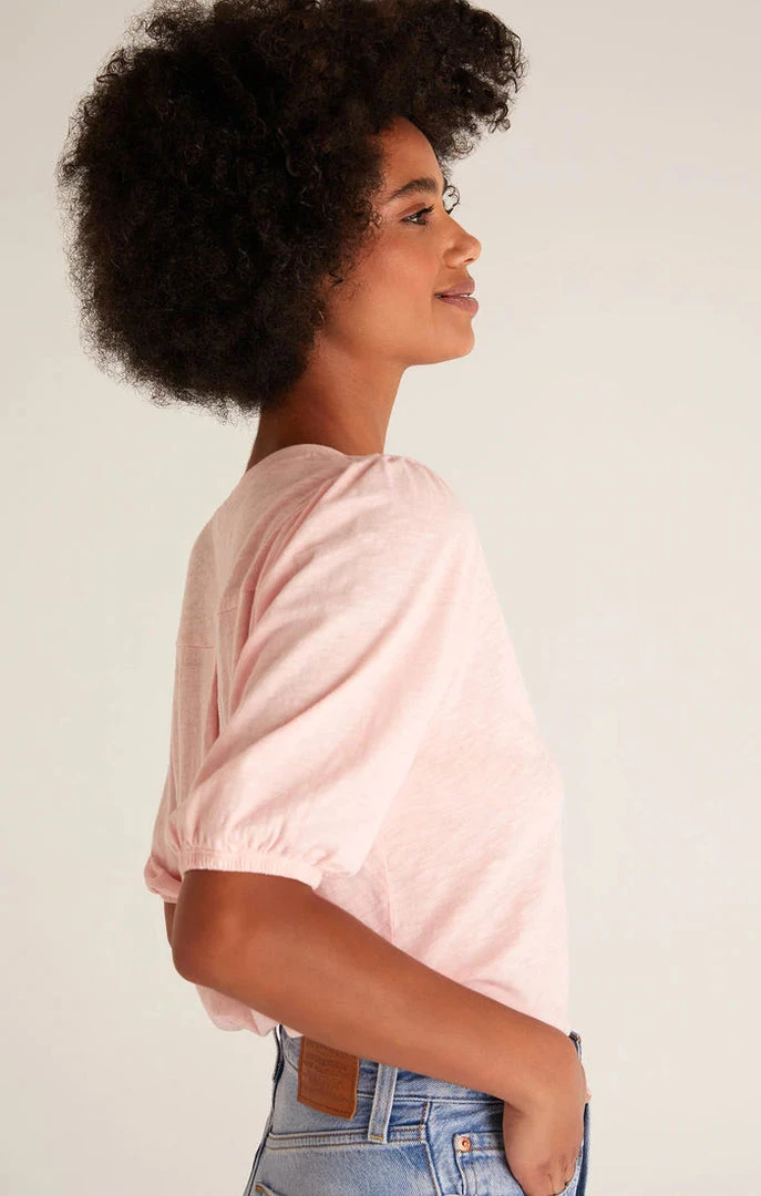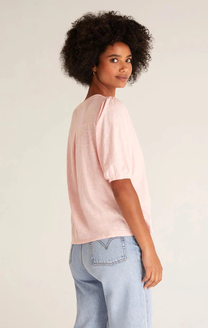 So buttery soft, our cotton Slub Jersey knit fabric is a favorite, no matter the season. The relaxed and comfy Kate Henley Slub Top features a button-front, open neckline, pleated detail at the back and feminine puff sleeves that elevate this stylish top.Â