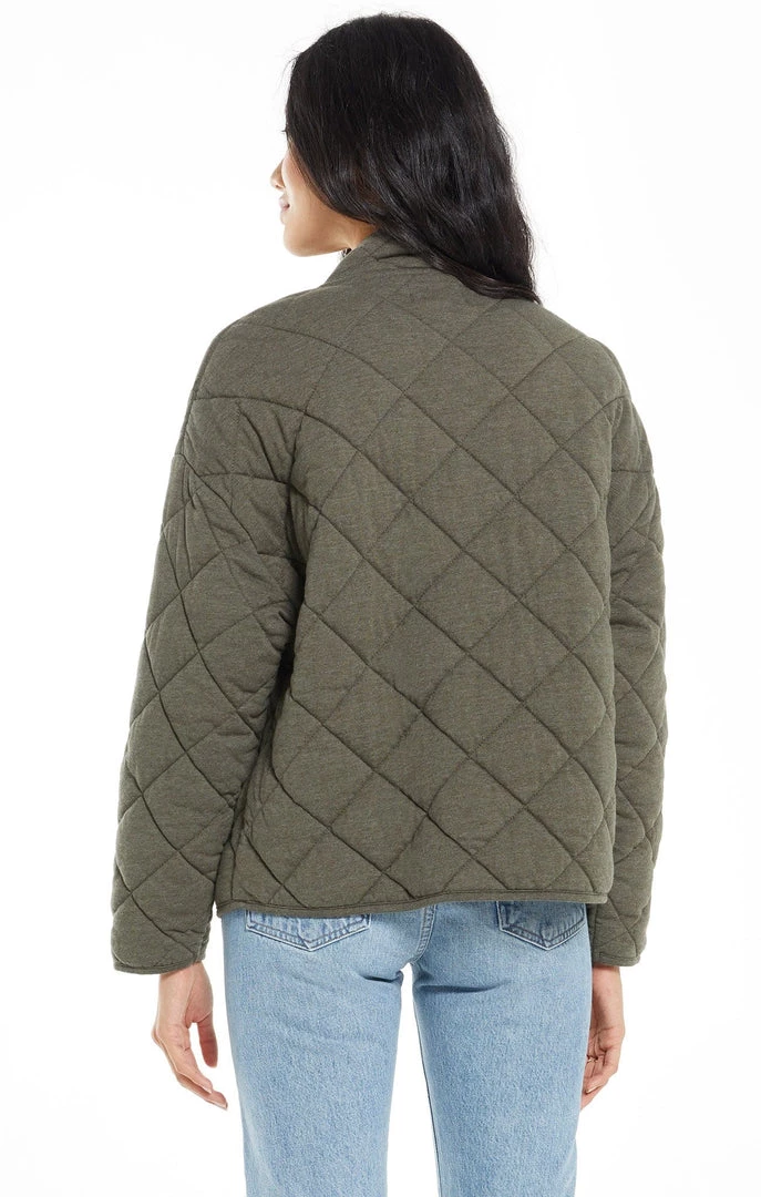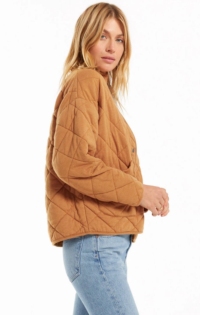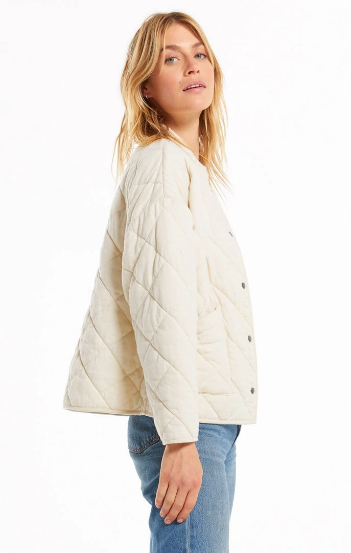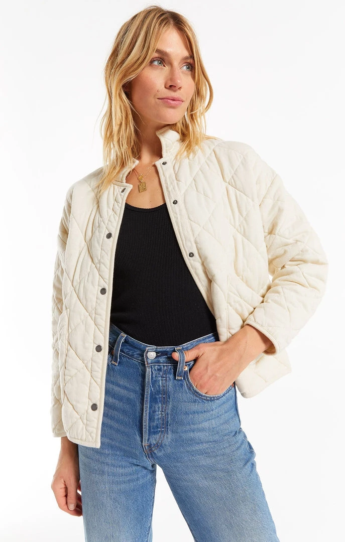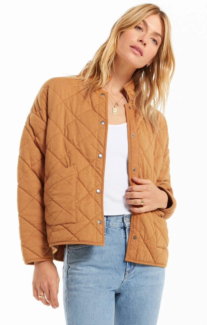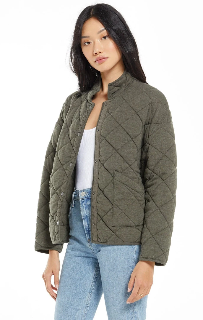 The Maya Quilted Jacket is an absolute essential this season! This lightweight puff jacket makes for the perfect transitional piece from cool to cold weather. This jacket features a drop shoulder and a stylish boxy fit. Made from a cotton/poly jersey knit fabric, we know you’ll love all the details such as the collar, snap-front closure, and patch pockets.