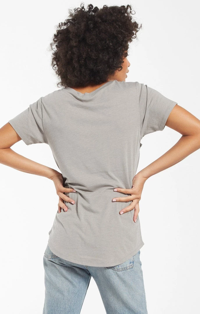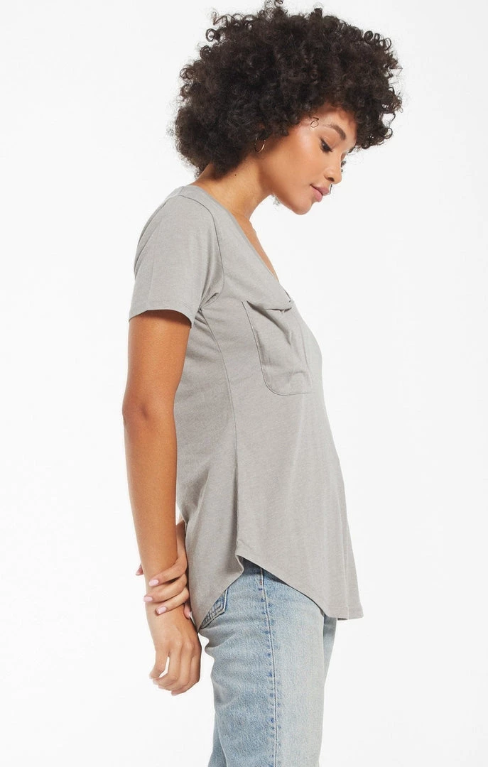 Favorite tee is an understatement. Made from our signature burnout jersey, this tee is complete with a curved v-neckline and a slouchy raw edge pocket. Because of its soft feel and chic fit, you will want to stock up in every color.